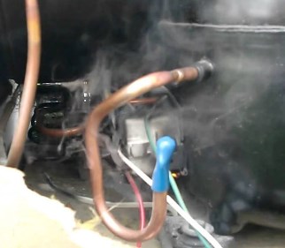 Холодильник источает запах горелой пластмассы, иногда виден синеватый дым, идущий от задний стенки агрегата.